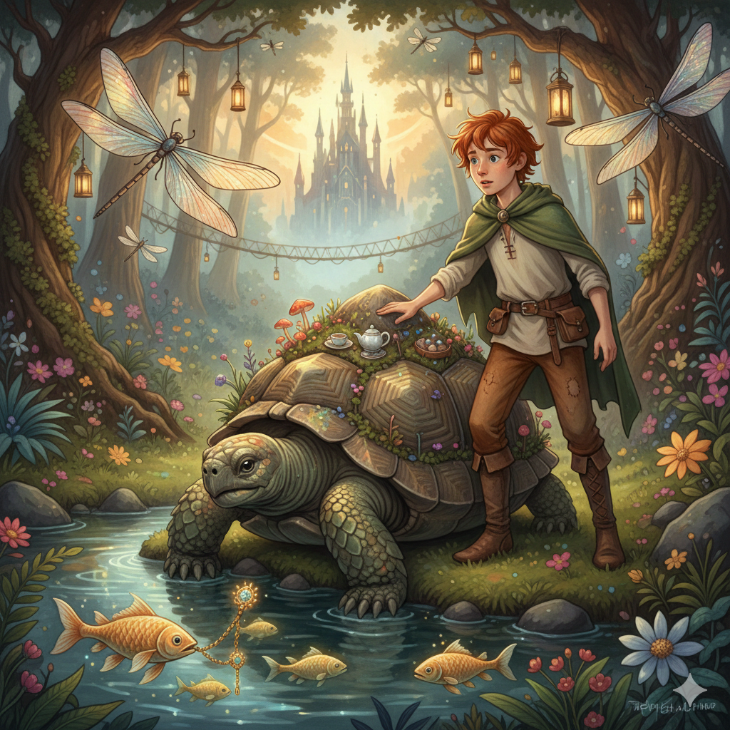 Aus dem hohen Farn schob sich ein riesiger, bemooster Panzer. Es war Kasimir, die uralte Schildkröte des Elfenlands. Auf seinem Rücken wuchsen keine Schuppen, sondern kleine leuchtende Pilze und ein winziger Teegarten.