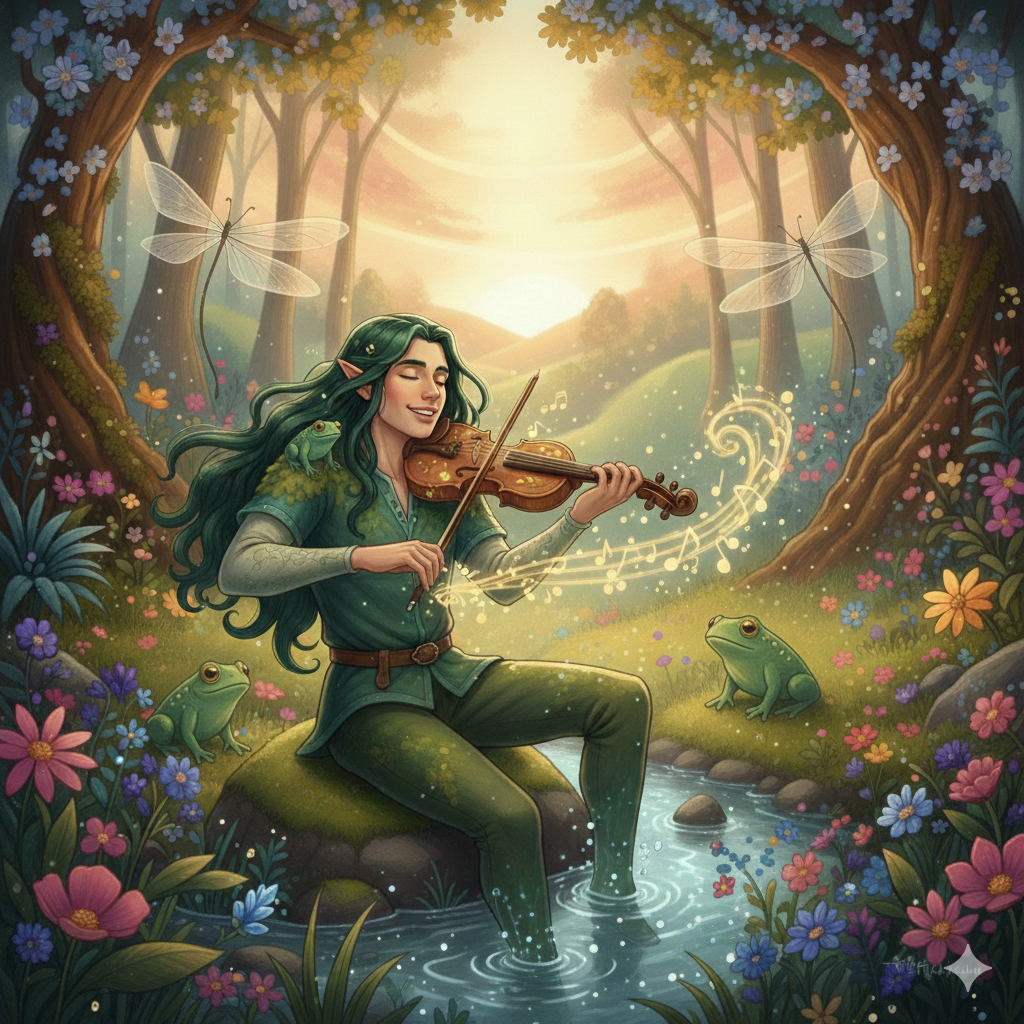 Schon als Kaulquappe hatte er bemerkt, dass die Vibrationen der Elfenlieder, die aus den Baumwipfeln herabschwebten, etwas Besonderes in ihm auslösten. Während andere Frösche sich mit dem Fangen von Libellen begnügten, saß Nöck oft stundenlang am Ufer, die Augen geschlossen, und lauschte den fernen Melodien. Eines Tages fand er im Schilf eine winzige Geige, nicht größer als ein Eichelhut, die ein vergessener Elf dort zurückgelassen hatte.